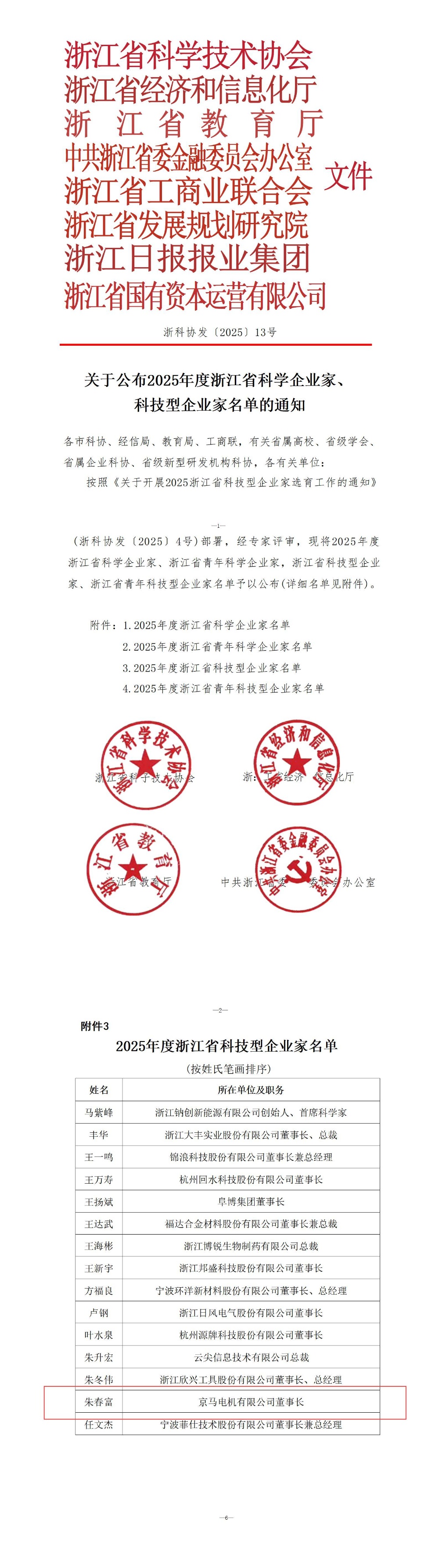 近日,由浙江省科協(xié)、省經(jīng)信廳、省教育廳等聯(lián)合發(fā)起的2025年浙江省科技型企業(yè)家選育工作正式公布榜單。京馬電機(jī)有限公司董事長朱春富先生成功入選2025年浙江省科技型企業(yè)家。